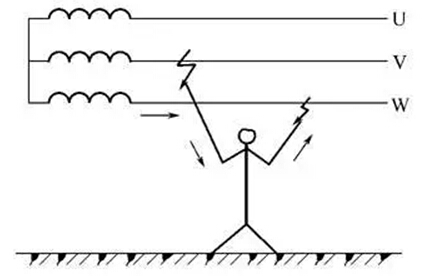 兩相觸電是指人體同時接觸設備或線路中的兩相導體而發生的觸電現象。若人體觸及一相火線、一相零線,人體承受的電壓為220V;若人體觸及兩根火線,則人體承受的電壓為線電壓380V。兩相觸電對人體的危害更大。