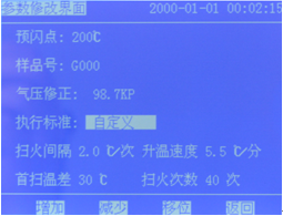 1)在此界面中預(yù)閃點(diǎn)、樣品號(hào)、氣壓、標(biāo)準(zhǔn)和時(shí)間,都可按提示進(jìn)行調(diào)整,修改完成后按【返回】鍵。回到主操作界面。