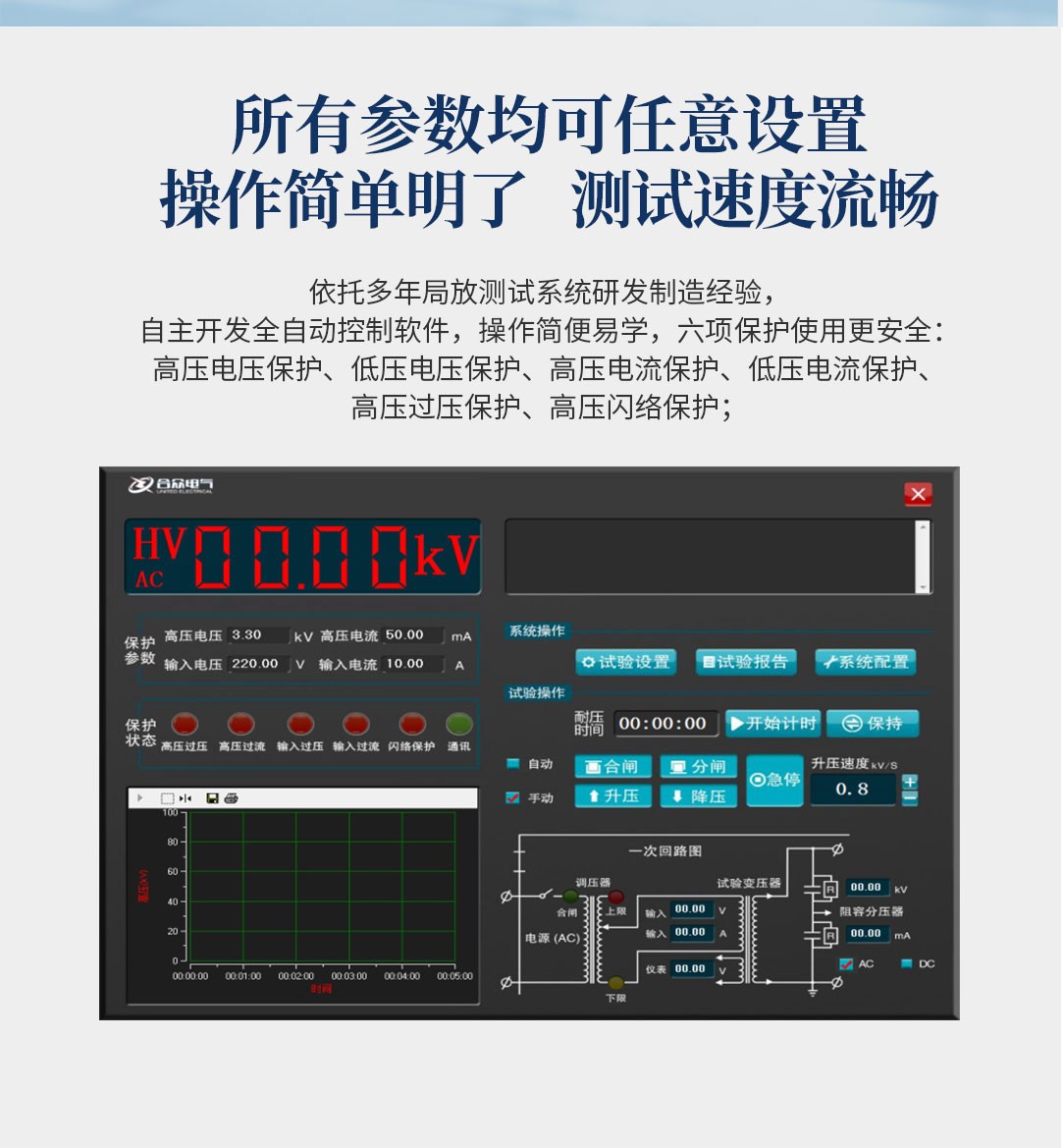 10、可設(shè)置多級(jí)階段式升降壓,設(shè)置好目標(biāo)電壓后,系統(tǒng)自動(dòng)升降壓,無(wú)需人工干預(yù),并可實(shí)時(shí)顯示升壓曲線圖。